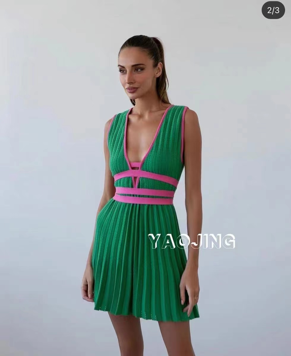 Green sleeveless dress knit pleated skirt*12